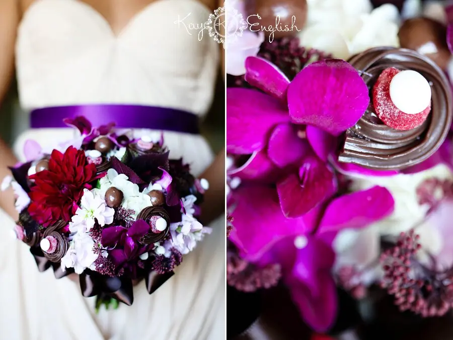Wow! I am just beyond excited to share this shoot with you! The idea was to design a Willy Wonka inspired wedding with concept and styling by Kay English, and event and floral design (including the candy bouquet) by the amazing MDS Floral Designs. It’s obviously not a real wedding but it’s so fun to inspire new wedding trends through doing editorial shoots! The shoot was set at the stunning Ashford Estate by Weddings of Distinction. The cappuccino colored wedding gown was provided by the incredible Sarah Seven and the beautiful purple hairpiece by Lo Boheme. The exquisite chocolate cake was designed by the lovely Jen at The Hudson Cakery. The delicious cookies and cake jars were designed by the awesome Tookies Etsy Shop. Krysalis Kreations did the stunning hair and makeup with the modern purple twist! The pretty purple belt is from Etsy’s Bridal Shoppe and the golden bowtie was handmade by Etsy’s Rufflentuck. The golden sparkle shoes are from Mod Cloth. Special thanks to Marla and Brian for modeling for the shoot and Kristina for 2nd shooting. So grab a bar of chocolate, and a cup of cappuccino and enjoy!!!